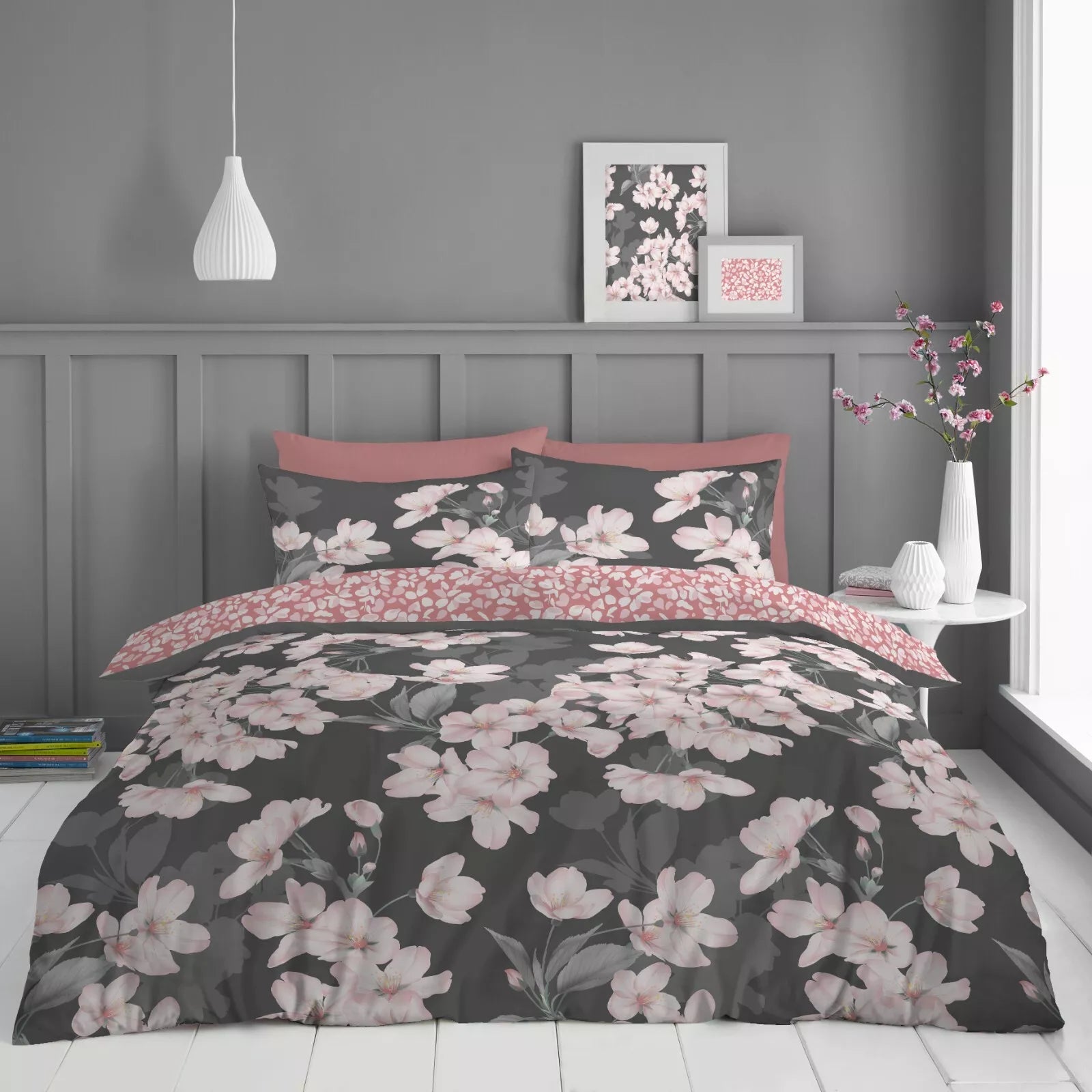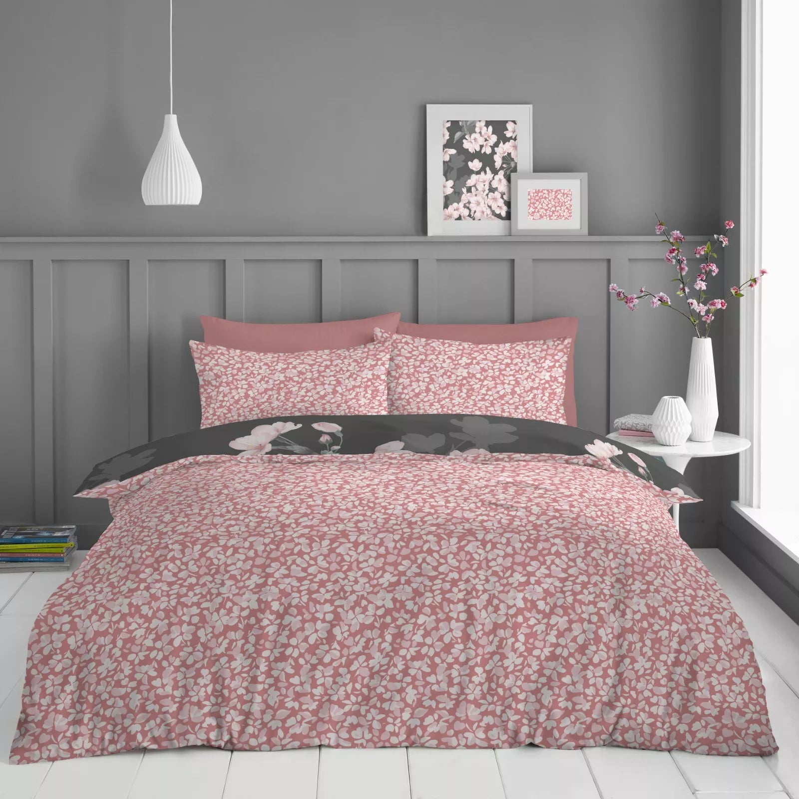 Give a stylish look to your bedroom with this pink and grey floral duvet set. Reversible design featuring a gorgeous floral collection and pale pink floral reverse. Each set comes with one duvet cover, one matching fitted sheet and two pillowcases. Beautifully crafted from a soft polycotton blend, this bedding set is durable, on-trend and soft on skin.